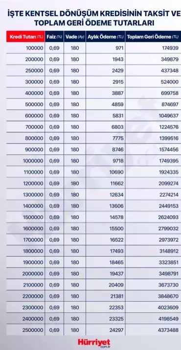 Uzun süredir yüzde 0.69 oranında faizle konut yapımı için kredi verilmiyordu. Bu kapsamda 180 ay vade ve 2.5 milyon liraya kadar kredi verilecek olması kentsel dönüşümü hızlandıracak.