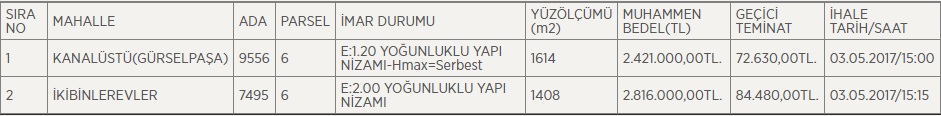 Seyhan Belediyesi Kanalüstü ve İkibinevler mahallerindeki mülkiyeti kendisine ait 2 adet arsayı ihaleyle satışa çıkardı. Arsaların değeri 5.2 milyon lira.