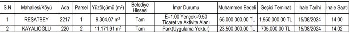 Madde 1- Mülkiyeti Belediyemize ait; aşağıda bilgileri bulunan taşınmazlar, 2886 sayılı Devlet İhale Kanununun 36. maddesine istinaden Kapalı Teklif (artırma)usulü ihale edilerek satılacaktır.