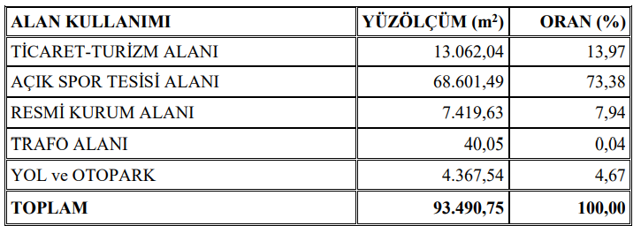 Mevcut imar planında "Bölge Parkı/Büyük Kentsel Yeşil Alan, Tarım Arazisi ve Doğal Sit Alanı" olarak yer alan söz konusu arazinin imar planı değiştirilerek “Ticaret-Turizm Alanı, Açık Spor Tesisi Alanı, Resmi Kurum Alanı, Trafo Alanı, Otopark ve Yol” olarak planlandı.