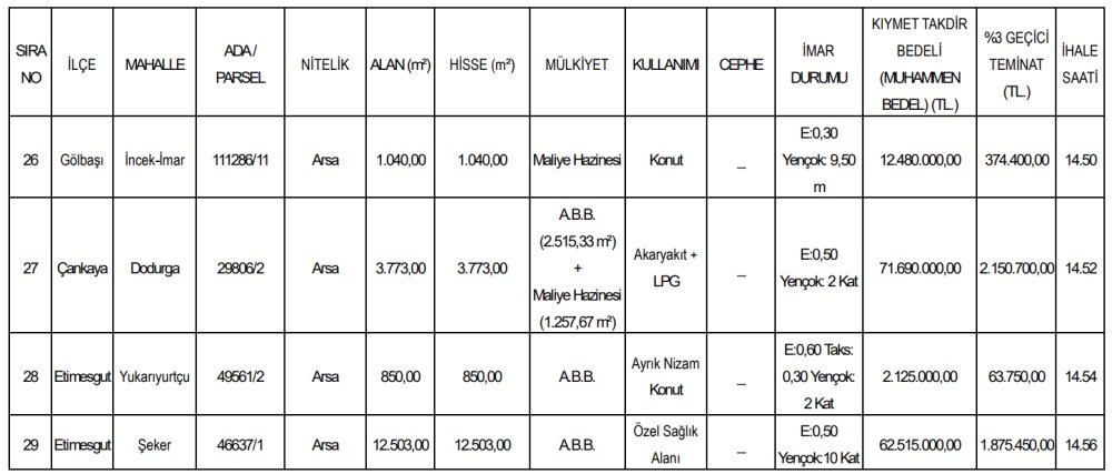 Ankara’nın 4 ilçesinde; içerisinde mağaza, mesken, arsa bulunan 29 adet taşınmaz satışa çıkarılıyor. Yatırımcılar için cazip fiyatlarla satışa sunulan taşınmazların ihalesi 26 Eylül Perşembe günü gerçekleşecek