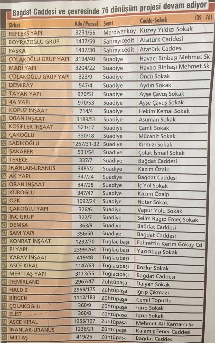 Bağdat Caddesi’ndeki projeler tam gaz devam ediyor. Halen süren 76 projede Mesa’dan Aydoğan İnşaat’a, İnanlar’dan Sadıkoğlu’na kadar çok sayıda şirket dönüşüm çalışmaları yürütüyor.