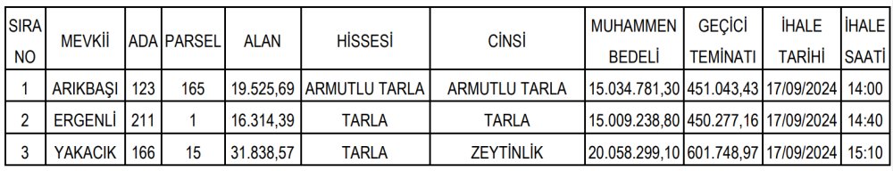 İzmir’in Bayındır ilçesinde; içerisinde 2 adet tarla, 1 adet ise zeytinlik bulunan 3 adet taşınmaz 50.101.000 TL bedelle satışa çıkarılıyor. Taşınmazların satış ihalesi 17 Eylül Salı günü gerçekleşecek