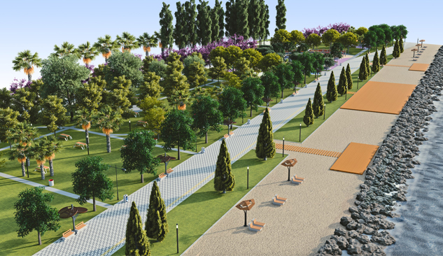 İzmir Büyükşehir Belediyesi, Bayraklı Şelale Deresi ve Adnan Kahveci Kavşağı arasında gerçekleştirilecek düzenleme kapsamında, sahil bandı boyunca kıyıyı ikiye bölecek, Bir tarafında kumsal düzenlemesi yapılacak, diğer tarafında ise beton şezlong, gölgelik ve ahşap güneşlenme terasları oluşturulacak.