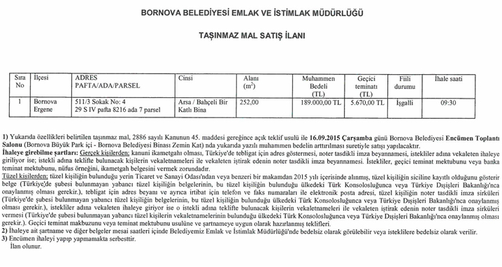 Bornova Belediyesi emlak ve istimlak müdürlüğünden yapılan duyuruda Bornova Ergene mahallesi 511/3 sokak No: 4 adresinde 8216 ada 7 parsel bahçeli bir katlı bina ihalesinin 16 eylül 2016 tarihinde gerçekleşeceği ifade edildi. İhale belirtilen tarihte Bornova Belediyesi encümen toplantı salonunda saat 09:30'da gerçekleşecek.