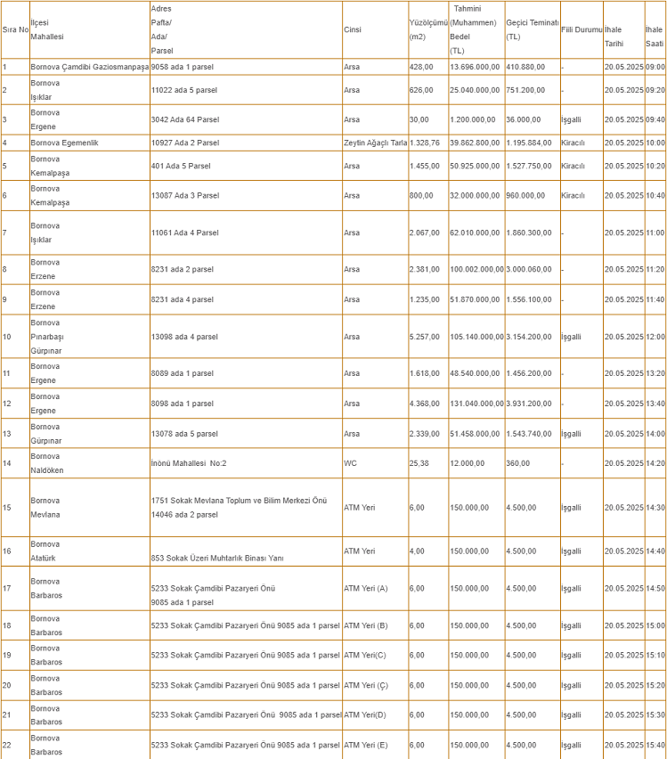 Bornova Belediye Başkanlığı; Ergene, Erzene, Pınarbaşı, Çamdibi, Kemalpaşa ve Işıklar mahallesinde yer alan 13 adet arsayı kapalı teklif usulüyle satışa çıkardı. İhalesi 20 mayısta gerçekleşecek arsaların değeri 712 milyon 783 bin TL olarak belirlendi.