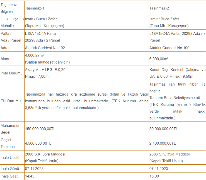 Buca Belediye Başkanlığı, Kuruçeşme mahallesinde yer alan 4.000 metrekarelik akaryakıt imarlı arsa ile 6.000 metrekarelik konut harici kentsel çalışma alanı imarlı 2 arsayı satışa çıkardı. İhalesi kapalı teklif usulüyle 7 kasımda gerçekleşecek.