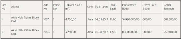 Kocaeli Çayırova Belediyesi Akse mahallesinde mülkiyeti kendisine ait 2 arsayı satışa çıkardı. 2 arsanın satış bedeli 25 milyon 318 bin TL olarak tespit edildi. İhalesi 9 ağustos tarihinde yapılacak.