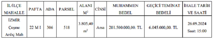 Türkiye’nin en önemli turistik beldelerinden Çeşme’nin göbeğindeki arsa 201 milyon 500 bin TL bedelle satışa çıkarılıyor. İhale 26 Eylül Perşembe günü gerçekleşecek.