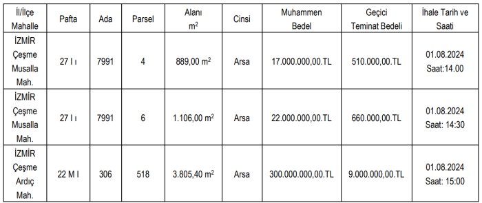 Resmi Gazete’de yer alan bilgiye göre; İzmir’in turizm beldesi Çeşme’de, Ardıç Mahallesi’nde ilçe belediye başkanlığınca 3805 metrekarelik arsa 300.000.000 TL bedelle satışa çıkarıldı. Taşınmazın satış ihalesi 1 Ağustos Perşembe günü gerçekleştirilecek. Öte yandan Çeşme’de Musalla Mahallesi’nde toplam değeri 39 milyon TL olan iki adet taşınmaz da satışa çıkarıldı. İhaleler aynı gün içinde gerçekleşecek.
