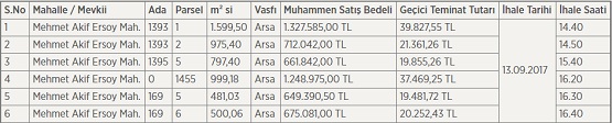Yalova Çiftlikköy Belediyesi Mehmet Akif Ersoy mahallesinde mülkiyeti kendisine ait 6 arsayı ihaleyle satışa çıkardı. Toplam bedeli 5 milyon 272 bin TL olan arsaların satış ihalesi 13 eylülde gerçekleşecek.