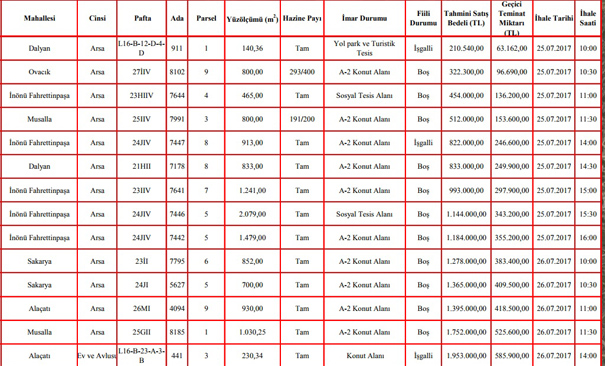 İzmir Defterdarlığı Çeşme'de çoğu konut imarlı 14 adet arsayı satışa çıkardı. Alaçatı, Dalyan, Musalla, İnönü Fahrettinpaşa, ovacık ve Sakarya mahallelerinde bulunan arsaların toplam satış bedeli 12 milyon 822 bin TL olarak belirlendi. İhalesi 25-26 temmu