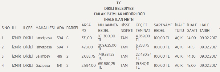 Dikili Belediyesi İsmetpaşa, Selimbey ve Gazipaşa mahallesindeki 4 adet arsayı satışa çıkarıyor. Arsaların toplam satış bedeli 1 milyon 771 bin TL. Arsaların satış ihalesi 9 şubatta gerçekleşecek.