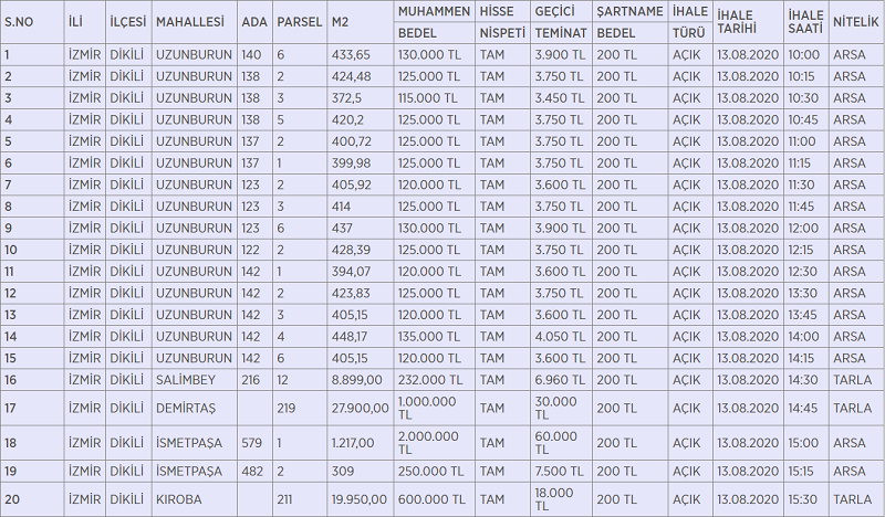 Dikili Belediye Başkanlığı Uzunburun, Salimbey, Demirtaş, İsmetpaşa, Kıroba ve Salihler mahallesindeki 20 adet arsa ile bir adet evi satışa çıkardı. Satışa çıkarılan arsa ve tarlaların fiyatı 120 bin TL 600 bin TL arasında değişiyor.