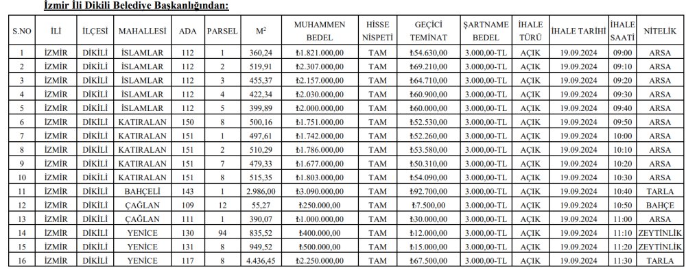 İzmir’in kuzey aksında yer alan; doğa güzellikleriyle de meşhur Dikili ilçesinde içerisinde; arsa, zeytinlik ve bahçe bulunan 16 adet arsa 250 bin TL’de başlayan fiyatlarla satışa çıkarılıyor. İhale 19 Eylül Perşembe günü gerçekleşecek.