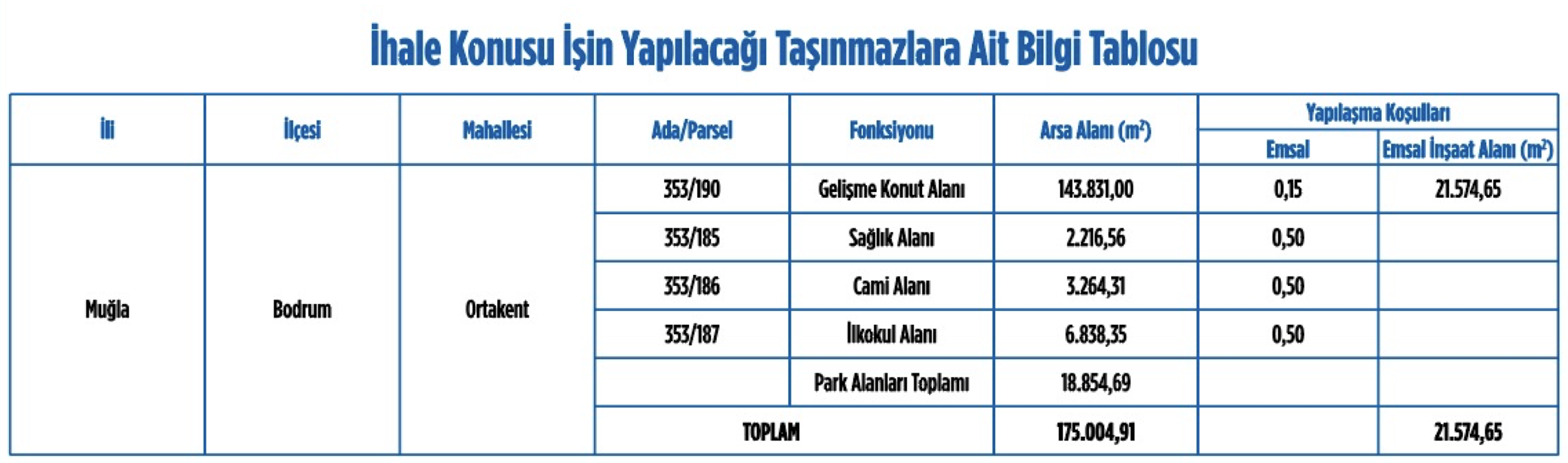 Emlak Konut Gayrimenkul Yatırım Ortaklığı’nın Bodrum Ortakent Müskebi arsasında gelişmekte olan konut alanı 143 bin 831 metrekare, sağlık alanı 2 bin 216,56 metrekare, cami alanı 3 bin 264,31 metrekare, ilkokul alanı 6 bin 838,35 metrekare, park alanları toplamı 18 bin 854,69 metrekare olarak açıklandı.