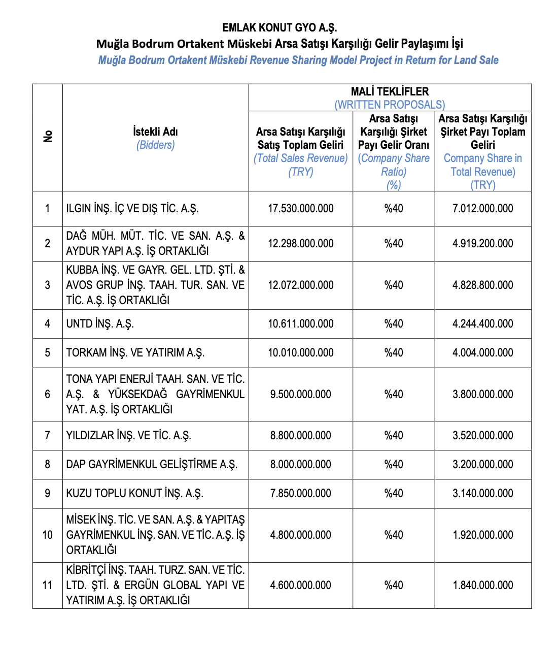 Emlak Konut GYO Muğla Bodrum Ortakent Müskebi Arsa Satışı Karşılığı Gelir Paylaşımı İşi ihalesinin 2. oturumuna teklif veren firmalar şu şekilde: