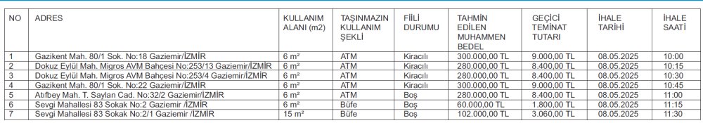 Yukarıda ayrıntısı belirtilen Mülkiyeti Belediyemize ait taşınmazlar, 2886 sayılı Devlet İhale Kanununun 45. Maddesine göre Açık Teklif Usulü yöntemiyle 3 (üç) yıl süreyle kiraya verilecektir. Söz konusu kiralama ihaleleri 08.05.2025 Perşembe günü tabloda belirtilen yıllık muhammen bedel üzerinden Gazi Mah. Önder Cad. No:41 K:3 Gaziemir/İZMİR adresinde bulunan Gaziemir Belediyesi Encümen Toplantı Salonunda yapılacaktır.