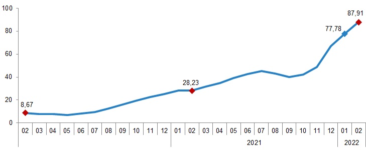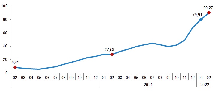 İnşaat maliyet endeksi, 2022 yılı Şubat ayında bir önceki aya göre %5,73 bir önceki yılın aynı ayına göre %90,27 arttı. Bir önceki aya göre malzeme endeksi %7,56, işçilik endeksi %0,23 arttı. Ayrıca bir önceki yılın aynı ayına göre malzeme endeksi %113,27, işçilik endeksi %41,38 arttı.