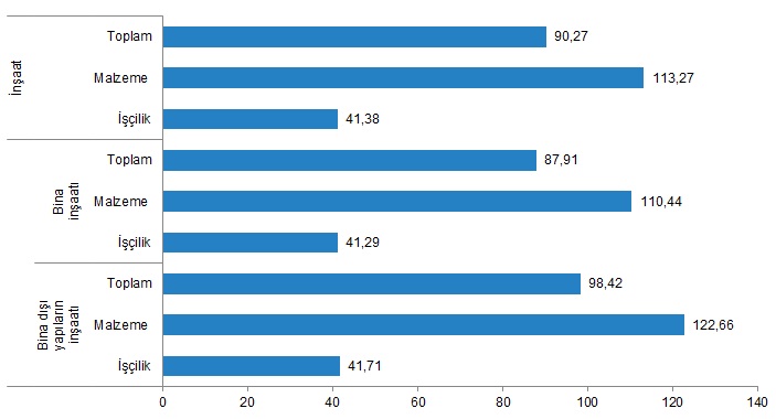 Bina inşaatı maliyet endeksi, bir önceki aya göre %5,82, bir önceki yılın aynı ayına göre %87,91 arttı. Bir önceki aya göre malzeme endeksi %7,82, işçilik endeksi %0,10 arttı. Ayrıca bir önceki yılın aynı ayına göre malzeme endeksi %110,44, işçilik endeksi %41,29 arttı.