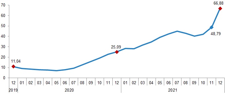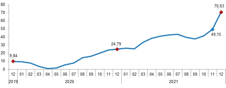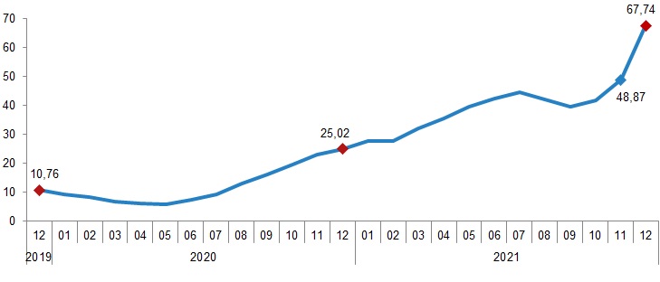 İnşaat maliyet endeksi, 2021 yılı Aralık ayında bir önceki aya göre %15,70, bir önceki yılın aynı ayına göre %67,74 arttı. Bir önceki aya göre malzeme endeksi %20,35, işçilik endeksi %1,44 arttı. Ayrıca bir önceki yılın aynı ayına göre malzeme endeksi %85,77, işçilik endeksi %24,01 arttı.