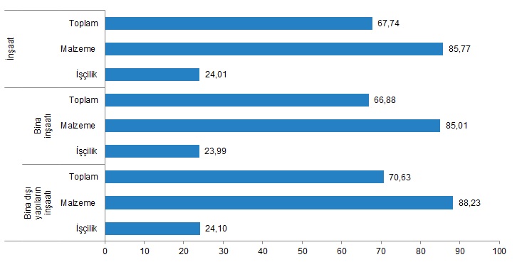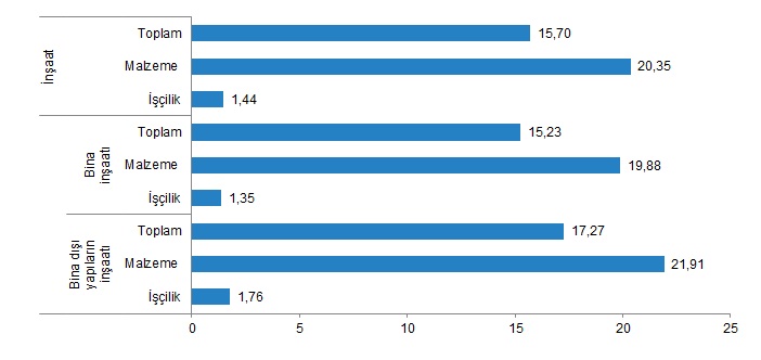Bina inşaatı maliyet endeksi, bir önceki aya göre %15,23, bir önceki yılın aynı ayına göre %66,88 arttı. Bir önceki aya göre malzeme endeksi %19,88, işçilik endeksi %1,35 arttı. Ayrıca bir önceki yılın aynı ayına göre malzeme endeksi %85,01, işçilik endeksi %23,99 arttı.