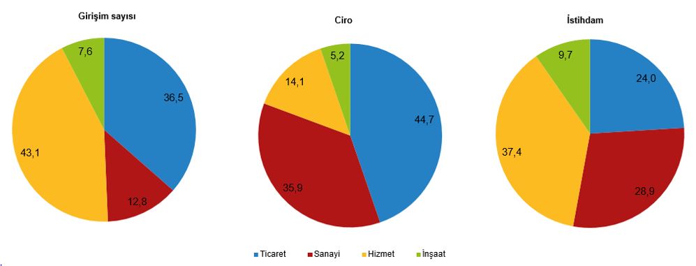Ticaret sektörü ciroda %44,7’lik pay ile ilk sırada yer aldı. Girişimlerin en fazla yer aldığı ve istihdam payı en yüksek olan hizmet sektörünün ciro payı %14,1 iken, sanayi sektörünün ciro payı %35,9 oldu.