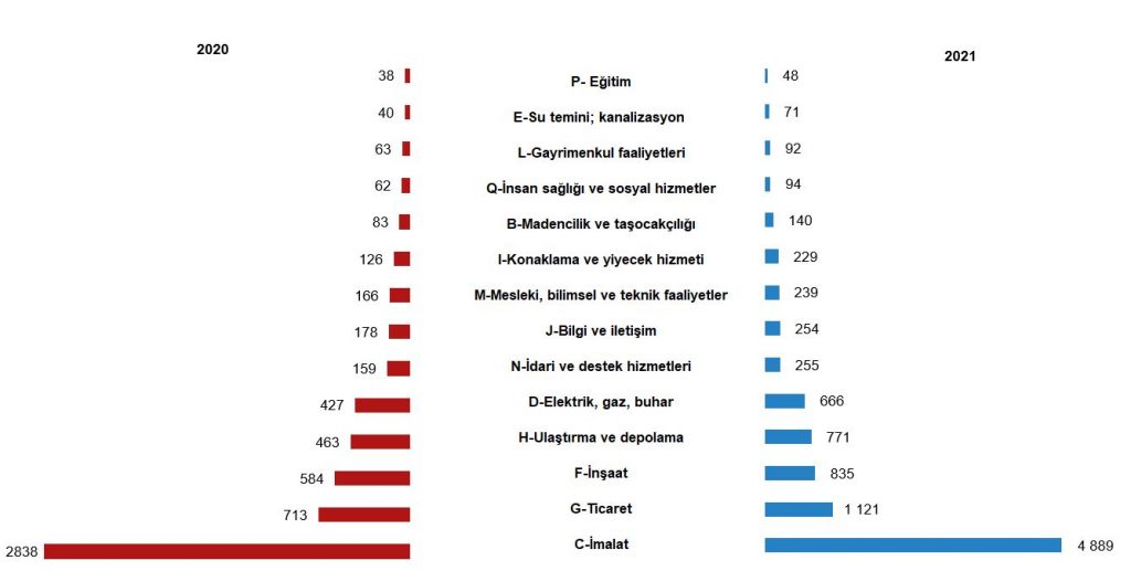 2021 yılında üretim değeri imalatta 4 trilyon 889 Milyar TL, ticarette 1 trilyon 121 milyar TL, inşaatta 835 milyar TL, ulaştırma ve depolamada 771 milyar TL ve elektrik, gaz, buhar ve iklimlendirme üretimi ve dağıtımında 666 milyar TL olarak gerçekleşti.