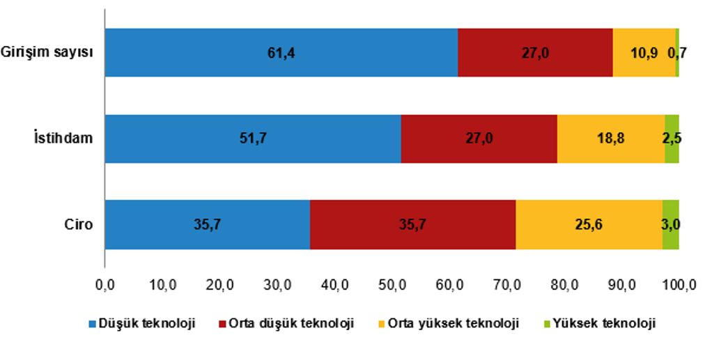 Düşük teknoloji faaliyetlerinde yer alan bu girişimler, istihdamın %51,7’sini, cironun %35,7’sini oluşturdu.
