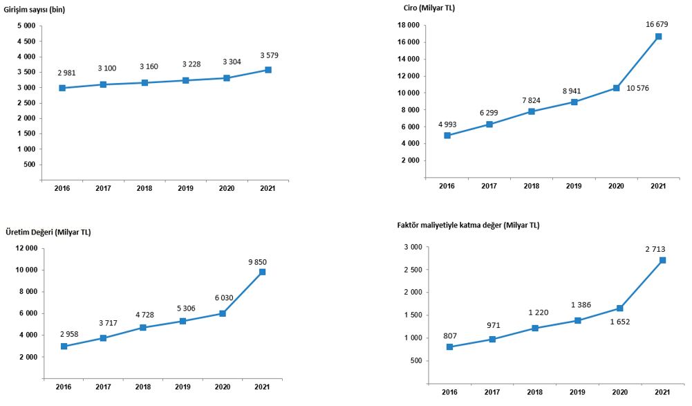Geçici sonuçlara göre 2021 yılında ciro 16 trilyon 679 milyar TL, üretim değeri 9 trilyon 850 milyar TL, faktör maliyetiyle katma değer 2 trilyon 713 milyar TL olarak gerçekleşirken mal ve hizmetlerin toplam satın alışları 15 trilyon 301 milyar TL olarak gerçekleşmiştir. İstihdam ise 17 495 511 kişi olarak gerçekleşti.