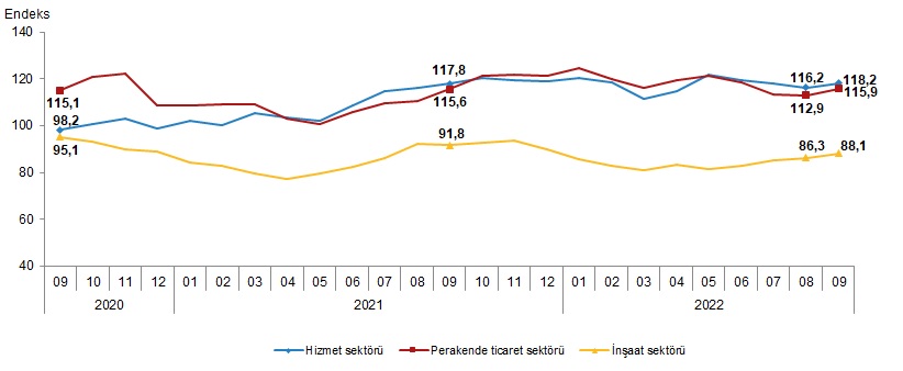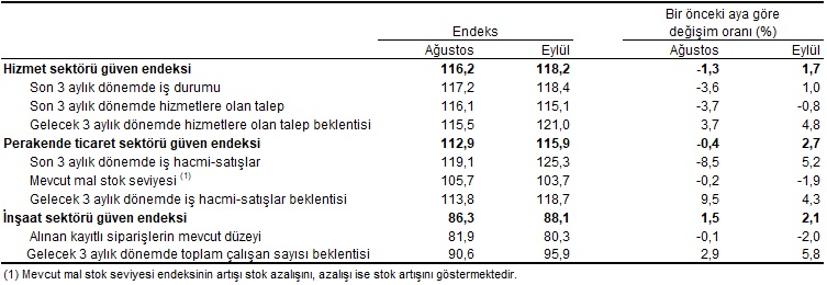Mevsim etkilerinden arındırılmış güven endeksi Eylül ayında bir önceki aya göre; hizmet sektöründe %1,7, perakende ticaret sektöründe %2,7 ve inşaat sektöründe %2,1 arttı.