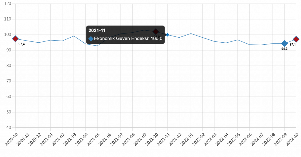 Türkiye İstatistik Kurumu (TÜİK), Ekim 2022 itibarıyla Ekonomik Güven Endeksi verilerini yayınladı. Verilere göre, Ekonomik güven endeksi yüzde 2,8 artarak 97,1 oldu.