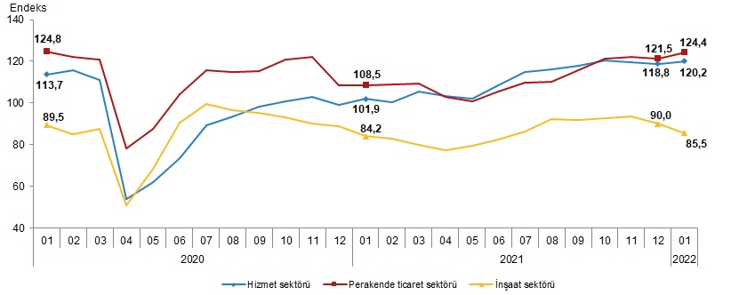Türkiye İstatistik Kurumu (TÜİK) tarafından açıklanan Hizmet, Perakende Ticaret ve İnşaat Güven Endeksleri Ocak 2022 istatistiklerine göre Mevsim etkilerinden arındırılmış güven endeksi 2022 Ocak ayında 2021 Aralık ayına göre; hizmet sektöründe %1,2 ve perakende ticaret sektöründe %2,5 artarken, inşaat sektöründe %5,0 azaldı.