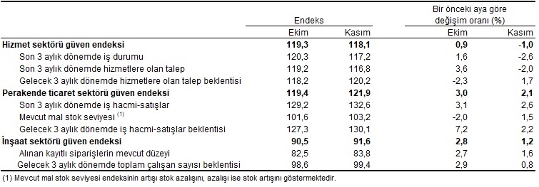 Türkiye İstatistik Kurumu (TÜİK), Kasım ayı itibarıyla Hizmet, Perakende Ticaret ve İnşaat Güven Endeksleri verilerini yayınladı. Buna göre, Mevsim etkilerinden arındırılmış güven endeksi Kasım ayında bir önceki aya göre; hizmet sektöründe %1,0 azalırken perakende ticaret sektöründe %2,1 ve inşaat sektöründe %1,2 arttı.