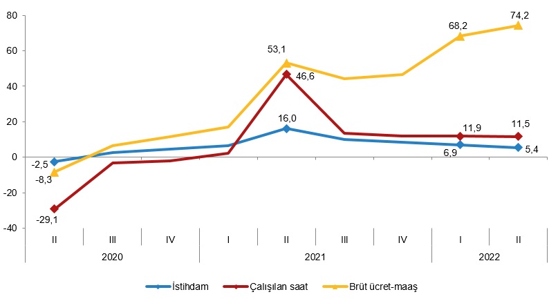 Sanayi, inşaat ve ticaret-hizmet sektörleri toplamında istihdam endeksi, 2022 yılı ll. çeyreğinde bir önceki yılın aynı çeyreğine göre %5,4 arttı. Alt sektörler incelendiğinde, endeks; sanayi sektöründe %4,4 arttı, inşaat sektöründe %6,3 azaldı, ticaret-hizmet sektörlerinde ise %8,4 arttı.