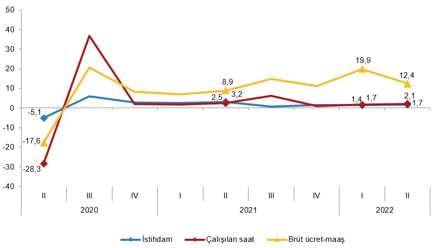 Sanayi, inşaat ve ticaret-hizmet sektörleri toplamında brüt ücret-maaş endeksi, 2022 yılı lI. çeyreğinde bir önceki çeyreğe göre %12,4 arttı. Alt sektörler incelendiğinde, endeks; sanayi sektöründe %12,9, inşaat sektöründe %9,4 ve ticaret-hizmet sektörlerinde %12,4 arttı.