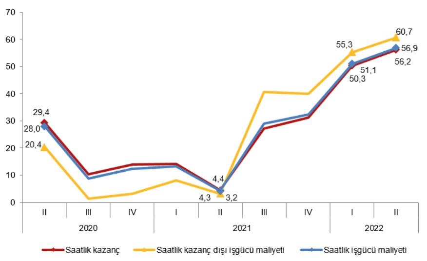 Sanayi, inşaat ve ticaret-hizmet sektörleri toplamında saatlik işgücü maliyeti endeksi, 2022 yılı lI. çeyreğinde bir önceki yılın aynı çeyreğine göre %56,9 arttı. Alt sektörler incelendiğinde, endeks; sanayi sektöründe %58,8, inşaat sektöründe %58,9 ve ticaret-hizmet sektörlerinde %54,3 arttı.