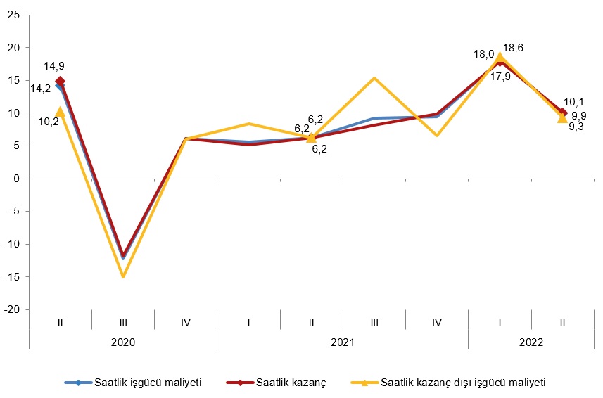 Sanayi, inşaat ve ticaret-hizmet sektörleri toplamında saatlik kazanç dışı işgücü maliyeti endeksi, 2022 yılı Il. çeyreğinde bir önceki yılın aynı çeyreğine göre %60,7 arttı. Alt sektörler incelendiğinde, endeks; sanayi sektöründe %65,4, inşaat sektöründe %64,2, ticaret-hizmet sektörlerinde %56,2 arttı.