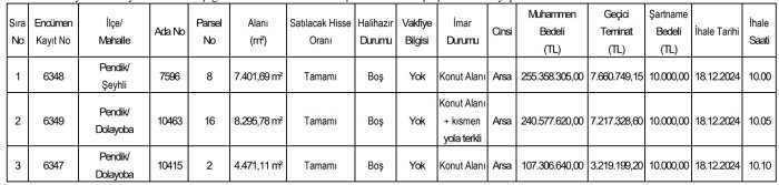 İstanbul’un Pendik ilçesinde 3 adet arsa vasıflı taşınmaz toplam 603.242.565 TL’ye satışa çıkarılıyor. Taşınmazların ihalesi 18 Aralık Çarşamba günü gerçekleşecek