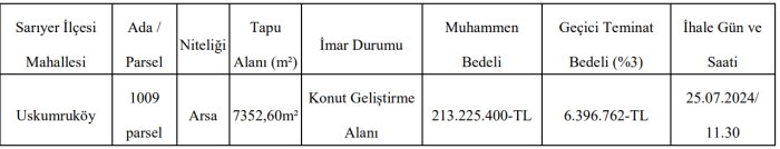 Resmi Gazete’de yer alan bilgiye göre; İstanbul’un Sarıyer ilçesinde; mülkiyeti ilçe belediye başkanlığına ait arsa 213.225.400 TL bedelle satışa çıkarılıyor. Taşınmazın satış ihalesi 25 Temmuz Perşembe günü gerçekleşecek