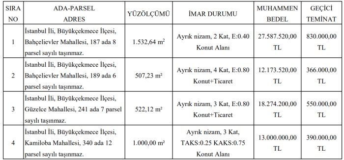 Resmi Gazete’de yer alan ilana göre; İstanbul’un Bahçelievler ilçesinde toplam değeri 71.035.240 TL olan 4 adet taşınmaz satışa çıkarılıyor. Taşınmazların satı ihalesi 13 Ağustos Salı günü gerçekleştirilecek.