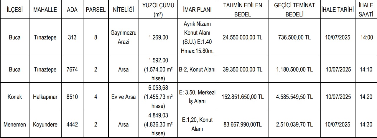 İzmir Büyükşehir Belediyesi, mülkiyetinde bulunan 4 adet arsayı satışa çıkardı. Toplam 300 milyon 419 bin TL değer biçilen taşınmazların satış ihalesi 10 Temmuz Perşembe günü gerçekleştirilecek.