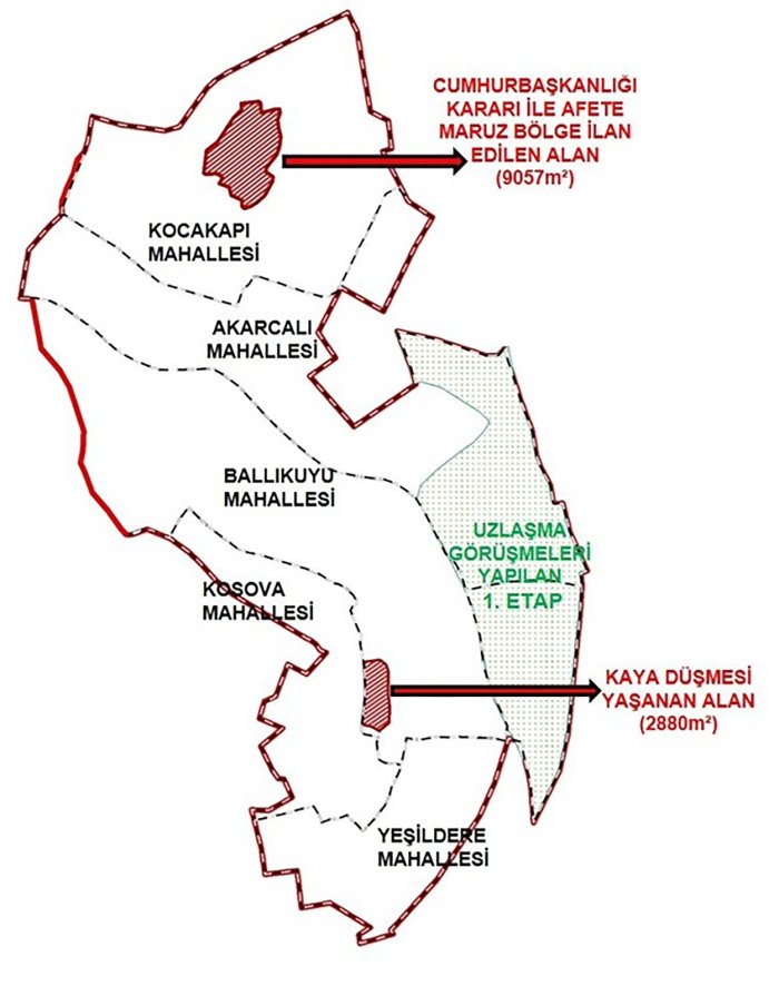 Ayrıca söz konusu dönüşüm alanı içerisinde yaklaşık 1 ha. büyüklüğündeki alan AFAD tarafından hazırlanan 06.06.2018 tarihli jeolojik etüt raporu doğrultusunda, 14.01.2019 tarihinde Cumhurbaşkanı Kararı ile ‘Afete Maruz Bölge’ olarak belirlenmiştir. Belirlenen bu bölgede kamulaştırma çalışmaları sürdürülmektedir.