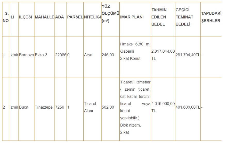 İzmir Büyükşehir Belediye Başkanlığı, Bornova Evka-3 ve Buca Tınaztepe'de yer alan konut ve ticaret alanı imarlı 2 arsayı satışa çıkardı. Satışa çıkarılan arsaların toplam satış bedeli 6 milyon 833 bin TL olarak belirlendi. İhale ''açık teklif (artırma) usulü'' ile İzmir Büyükşehir Belediyesi Mimar Sinan Mahallesi Kültürpark İçi 2 No'lu Hol Basmane-Konak/İZMİR adresindeki Hol-2 binasında 2183 Oda No'lu Encümen Toplantı Salonu'nda komisyon huzurunda 11/05/2023 Perşembe günü yapılacak.