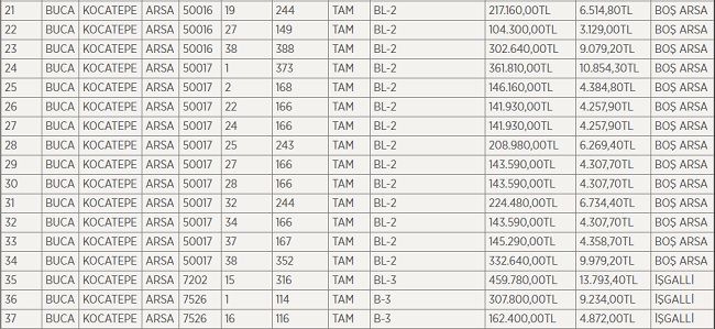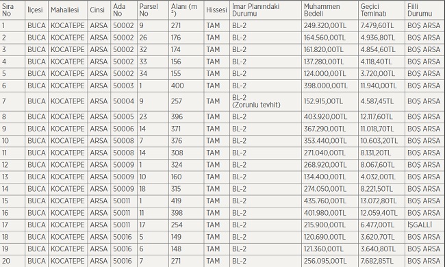 İzmir Büyükşehir Belediyesi Buca Kocatepe mahallesinde bulunan 37 adet arsayı ihaleyle satışa çıkardı. Satış bedelleri 120 bin ile 435 bin TL arasında değişen arsaların ihalesi 26 Ekim 2017'de yapılacak.