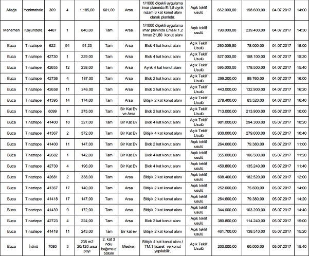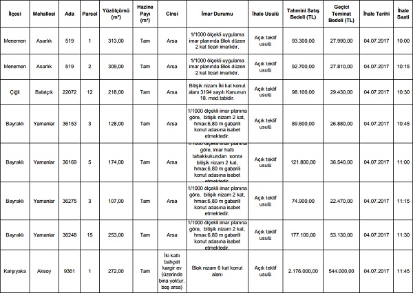 İzmir Defterdarlığı mülkiyetindeki 30 adet taşınmazı açık artırma usulüyle ihaleye çıkarıyor. Çoğu imarlı arsa olan taşınmazların ihale tarihi 4-5 temmuz olarak belirlendi. Satışa çıkan taşınmazlar Karşıyaka, Çiğli, Buca, Menemen, Bayraklı ve Aliağa ilçel