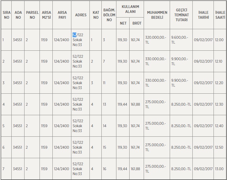 Yukarıda ayrıntısı belirtilen Mülkiyeti Belediyemize ait taşınmaz malların tamamı 2886 sayılı Devlet İhale Yasasının 45.maddesine göre Açık Teklif Usulü yöntemiyle 09/02/2017 Perşembe günü karşılarında belirtilen saatlerde tabloda belirtilen muhammen bedeller üzerinden Yeşillik Caddesi No:232 Karabağlar/İZMİR adresinde bulunan Karabağlar Belediyesi Encümen Toplantı Salonunda satışı yapılacaktır.