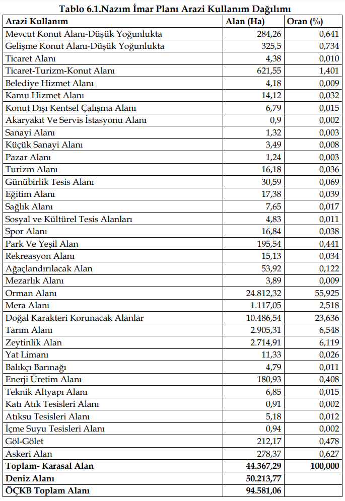 1/25.000 ölçekli nazım imar planı içinde en geniş yer tutan arazi kullanım kararları, orman alanları, mera alanları, doğal karakteri korunacak alanlar, tarım alanları ve zeytinlik alanlardır. Toplam büyüklüğü 42.036 hektara ulaşan bu alanlar, toplam alan içinde yaklaşık %95’lik yer tutmaktadır
