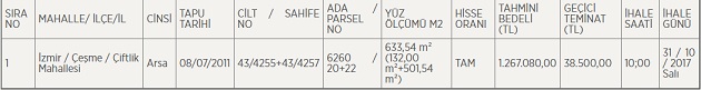 Karayolları 2. Bölge Müdürlüğü, İzmir Çeşme'de mülkiyeti kendisine ait arsayı satışa çıkardı. Yanyana 2 parselden oluşan arsa 633 metrekareden oluşuyor. Arsanın ihaleye çıkış bedeli 1 milyon 267 bin TL olarak tespit edildi.