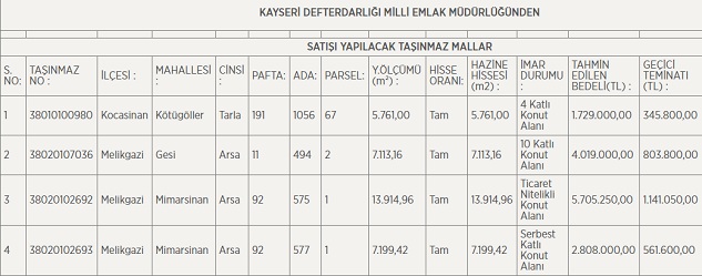 Kayseri Defterdarlığı Melikgazi ve Kocasinan ilçesinde bulunan mülkiyeti kendisine ait 4 arsayı 14 milyon 261 bin TL muhammen bedelle satışa çıkardı. arsaların satış ihalesi 8 ağustos tarihinde gerçekleşecek.